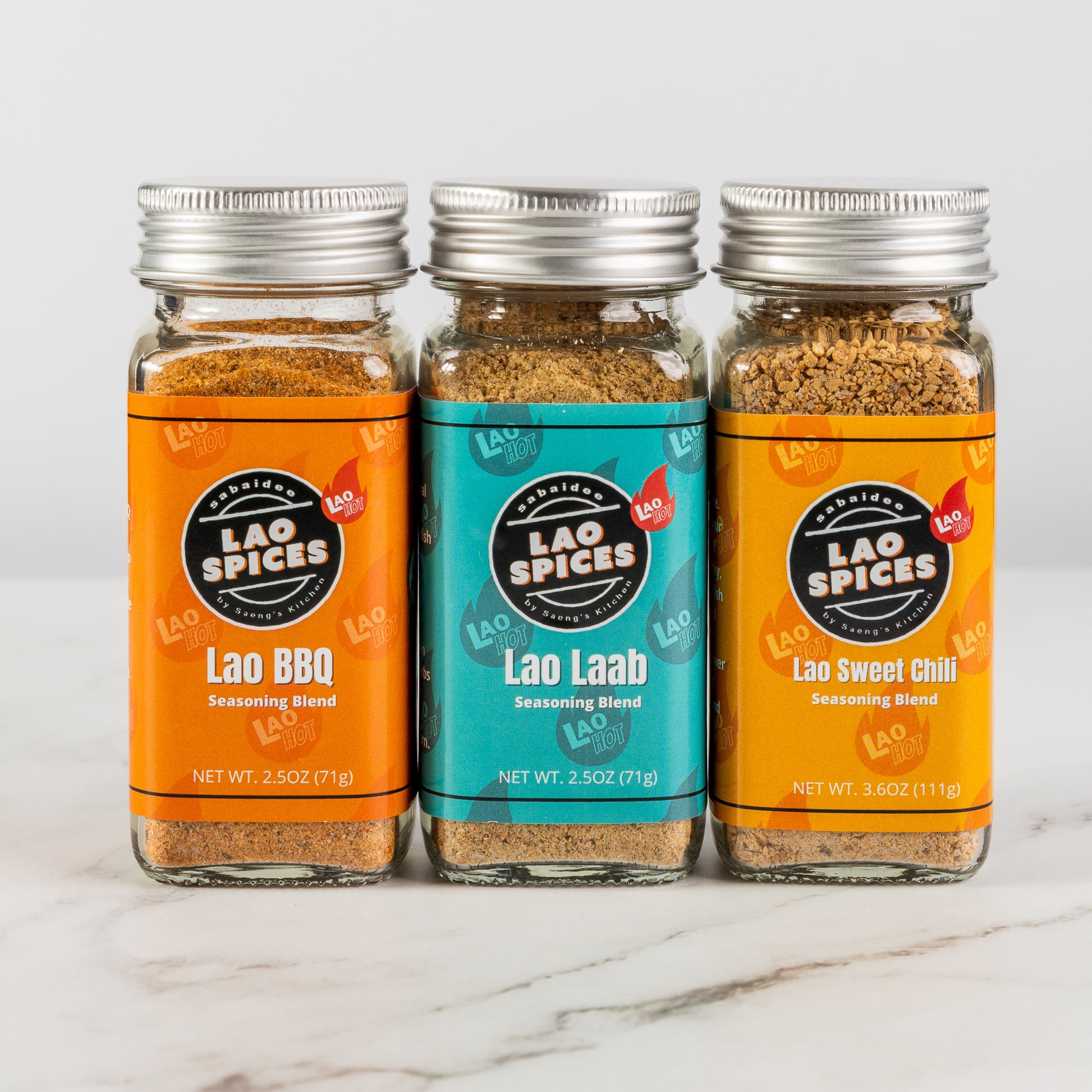 Experience the vibrant flavors of Laos with our 3-pack Lao Spice Seasoning. Elevate your BBQ with Lao BBQ, create a mouthwatering Laab with Lao Laab, and add a touch of heat to your sour fruits with Lao Sweet Chili. Unlock the essence of Lao cuisine and bring a taste of Laos into your kitchen.
